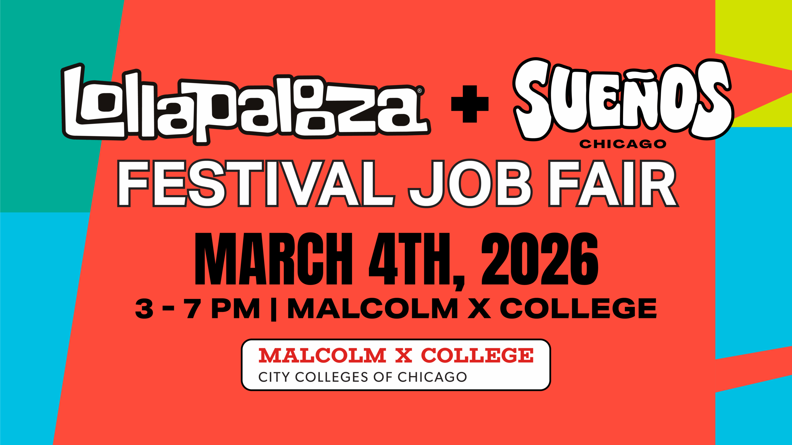 March 4 @ 3:00 pm - 7:00 pm Lollapalooza & Sueños Festival Job Fair 2026 Malcolm X District-wide Student Activities RSVP/Join Event Learn More